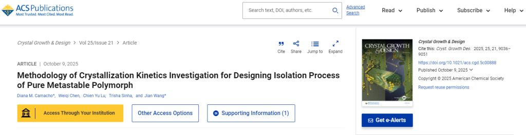 Recently, Porton team published a peer-reviewed article in Crystal Growth & Design, a journal of the American Chemical Society (ACS), titled “Methodology of Crystallization Kinetics Investigation for Designing Isolation Process of Pure Metastable Polymorph.”